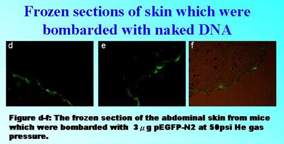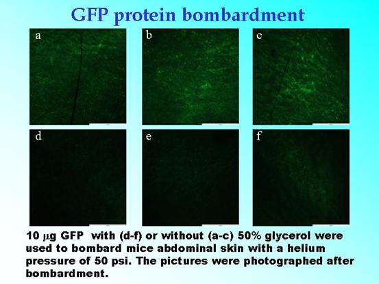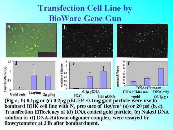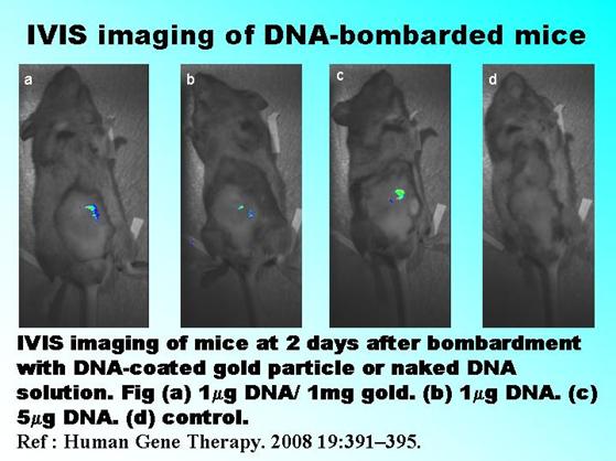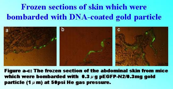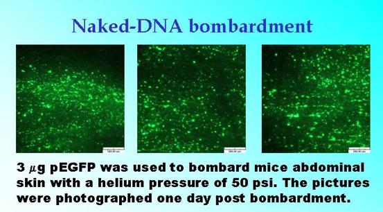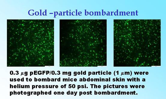 圖A為HeLa cell經Bio-Rad基因槍轟擊轉殖之結果 (Journal of neuroscience methods 2001, 112 : 57-64) 中間黑暗區域為deadzone。