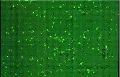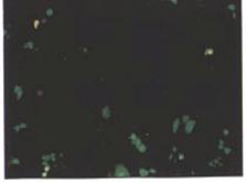 圖B為BHK cell以bioware基因槍轉殖之結果, 圖中平均散佈均勻螢光轉殖之細胞株。