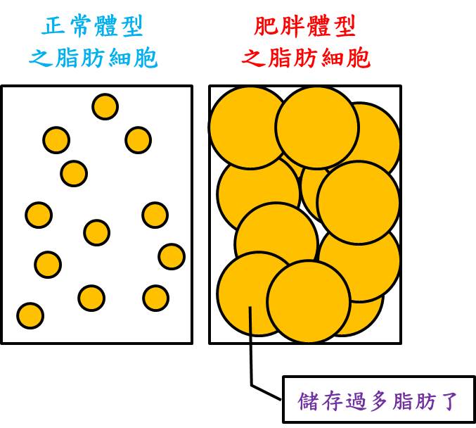 脂肪細胞會將不需使用的任何能量以脂肪方式儲存於細胞體內,造成細胞腫大2~3倍以上,並且刺激