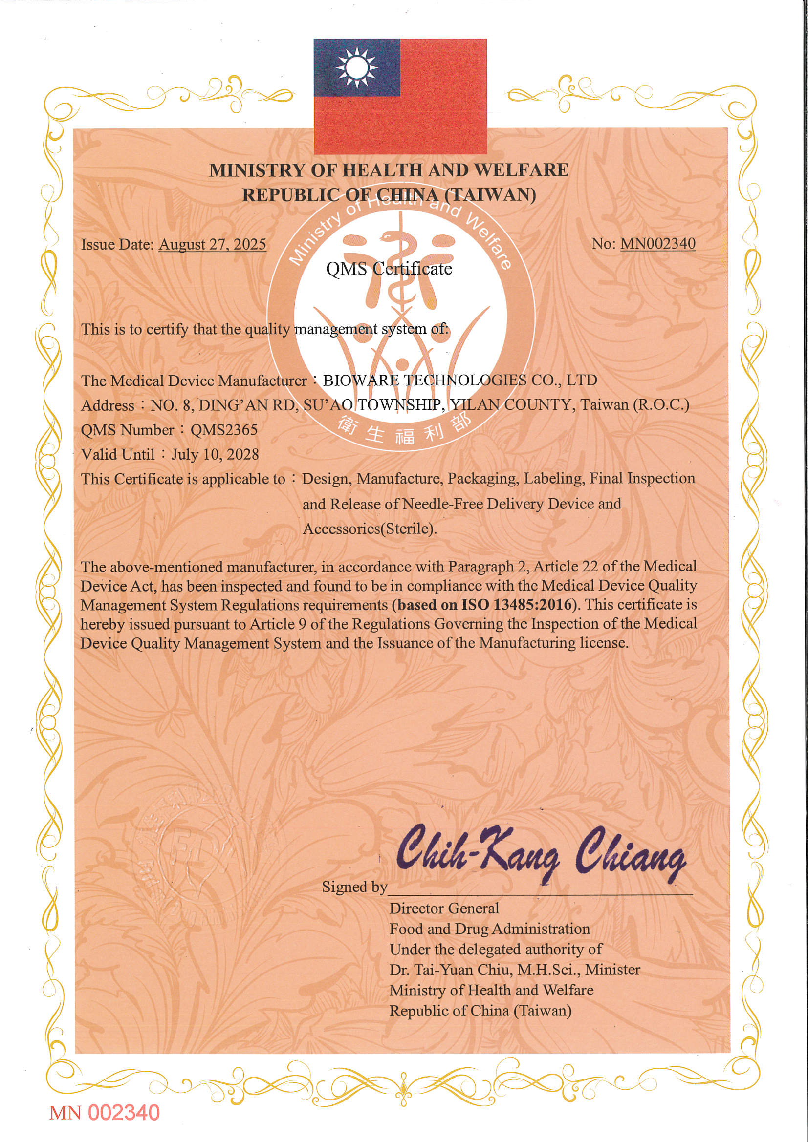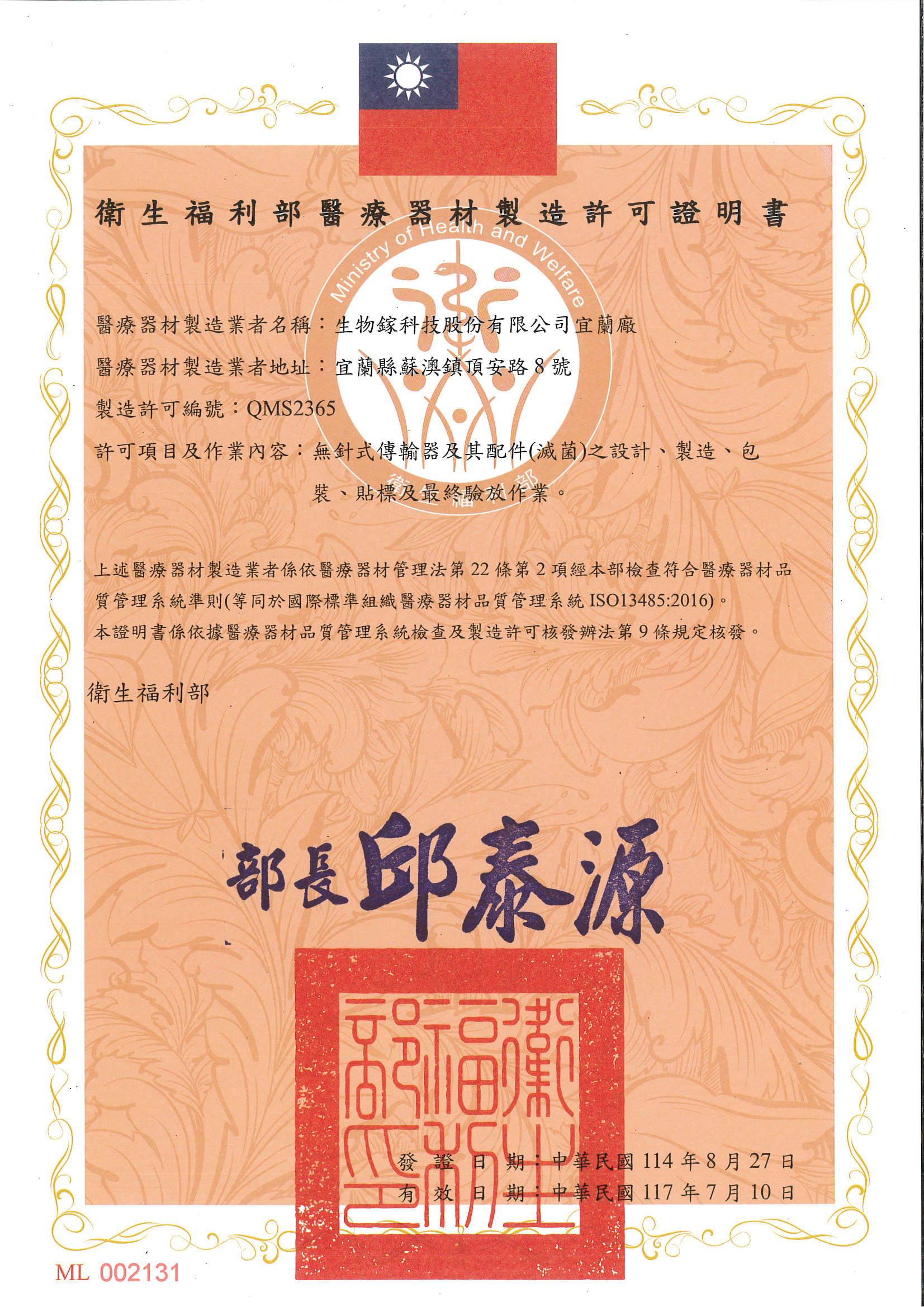 2025年08月 醫療器材 "生物鎵" 無針傳輸器及其配件 取得「QMS醫療器材廠」 合格認證。